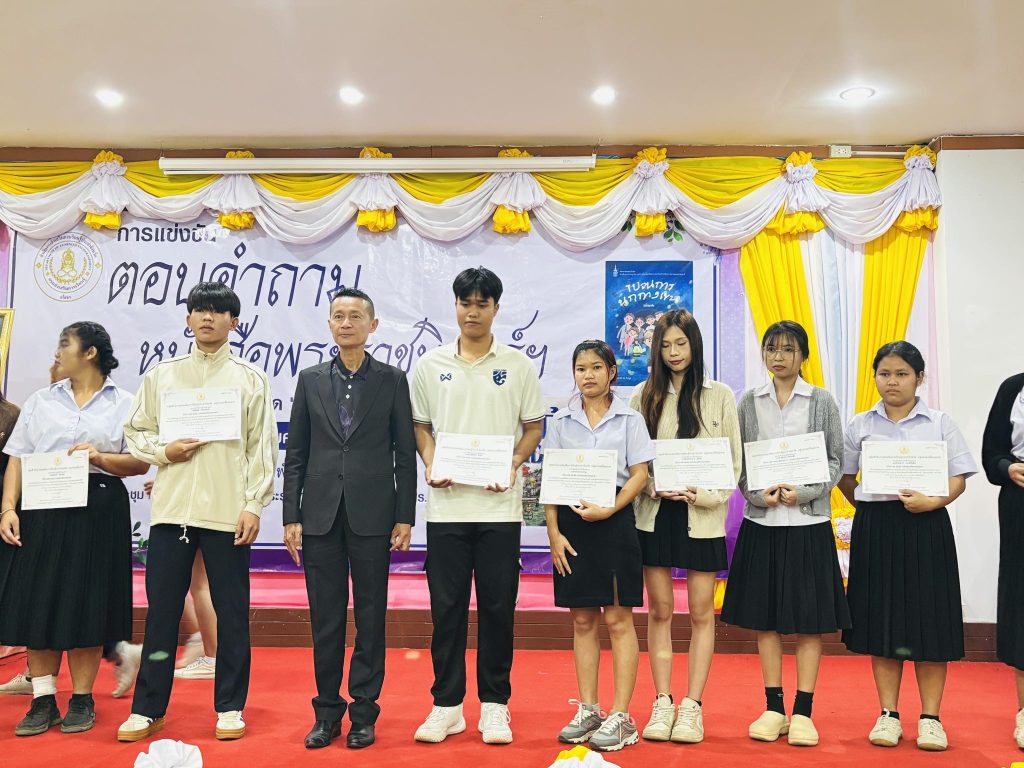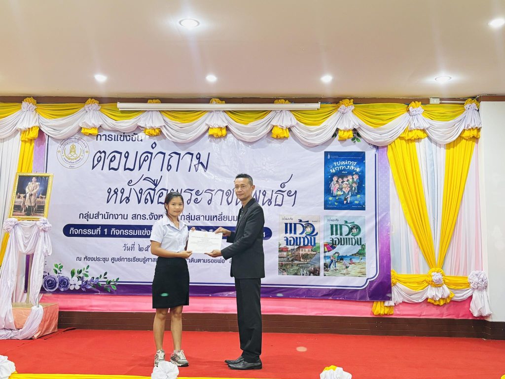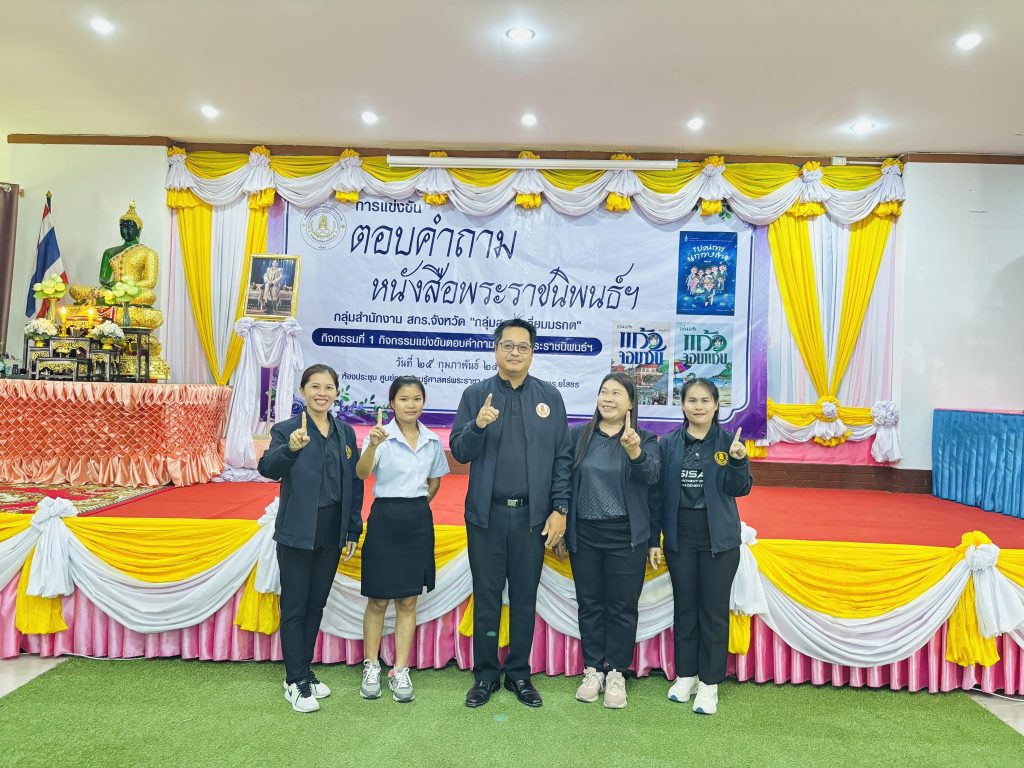 พร้อมด้วย บุคลากรในสังกัด นำผู้เรียน เข้าร่วมการแข่งขันตอบคำถามหนังสือพระราชนิพนธ์ฯ กลุ่มสำนักงาน สกร.ประจำจังหวัด “กลุ่มสามเหลี่ยมมรกต“ ได้รับรางวัล ระดับมัธยมศึกษาตอนปลาย ชนะเลิศ ลำดับที่ 1 ณ ห้องประชุมศูนย์การเรียนรู้ศาสตร์พระราชา “ตามรอยพ่อ” สกร.ยโสธร