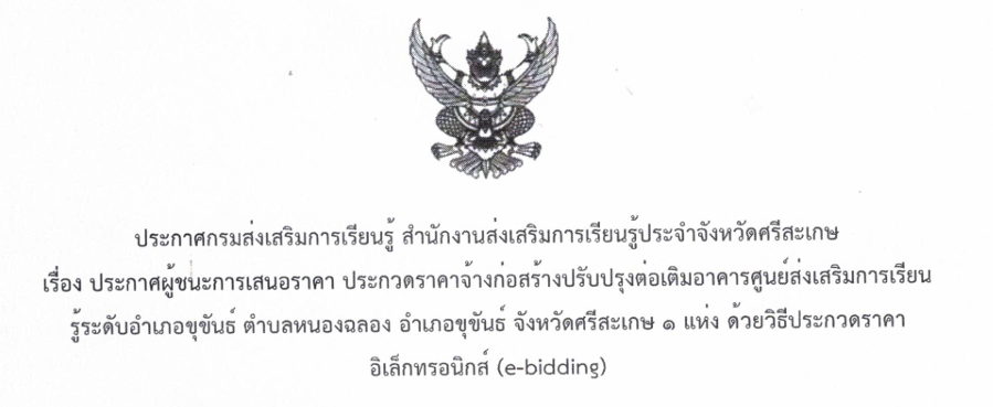 เรื่อง ประกาศผู้ชนะการเสนอราคา ประกวดราคาจ้างก่อสร้างปรับปรุงต่อเติมอาคารศูนย์ส่งเสริมการเรียน